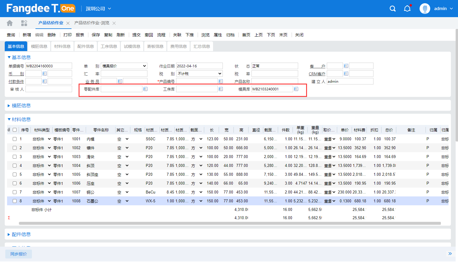 就這樣”1大+4小「模版報價法適合以前做過的相似模具,是站在前人的經驗基礎上進行估算成本,估算結果相對快速、準確。如果企業沒有做過類似的模具呢,有沒有更快速的模具報價方法? 方天T-ONE系統,依模具結構逐項快速展開,分別展開模胚、模仁、配件及銅料等,並且可以藉助CAD軟體,如UG,快速拆解主要零件,然後計算成本。依材料尺寸換算重量取得最新材質單價計算材料費用;依設計、機械加工、CNC等加工工時取得每種製程的單價計算加工費用;再估算必要的管理費用、運輸費、試模次數等。最後將材料費、加工費和管銷、利潤加在一起,即可得出模具的價格(下圖3)。