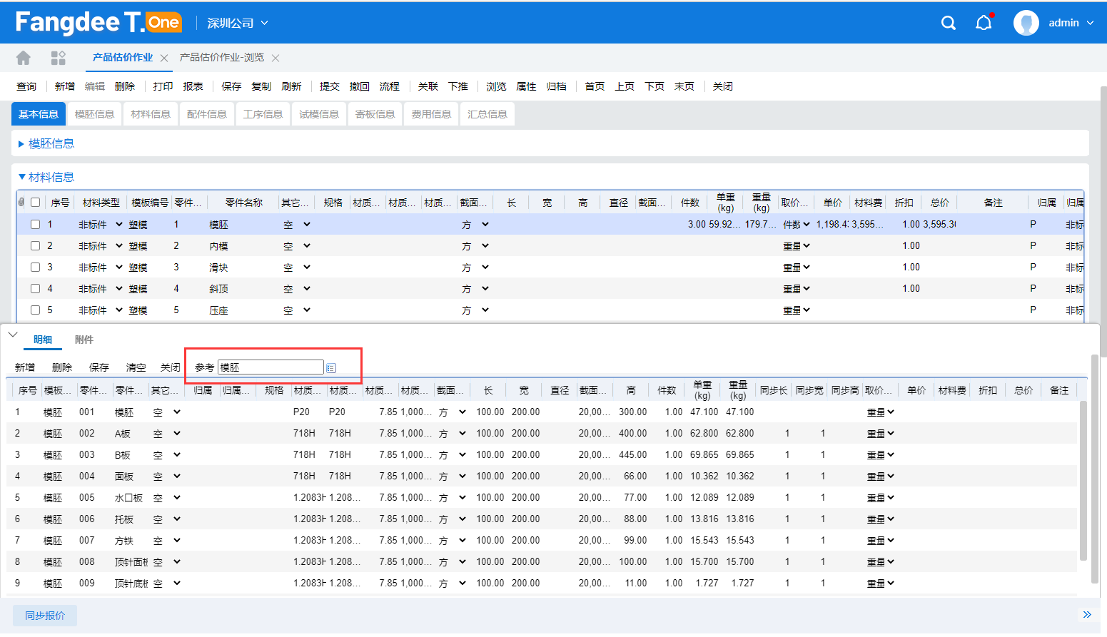 圖1 做模的人都知道,除了複製模(由於產品產量大,需要增加模具數量來滿足產量),並不存在完全相同的模具,調取以前做過的相似模具估價信息,也僅僅是第一步,如何根據本次客戶需求,如成品尺寸、外觀要求、模具精準度、難易度等進行估算調整,絕對就是一門技術活了。方天T-ONE系統在此方面就展現了其強大的運算能力,可以針對模胚、零件、配件及加工工藝等單獨取得參考模版(見下圖2)。