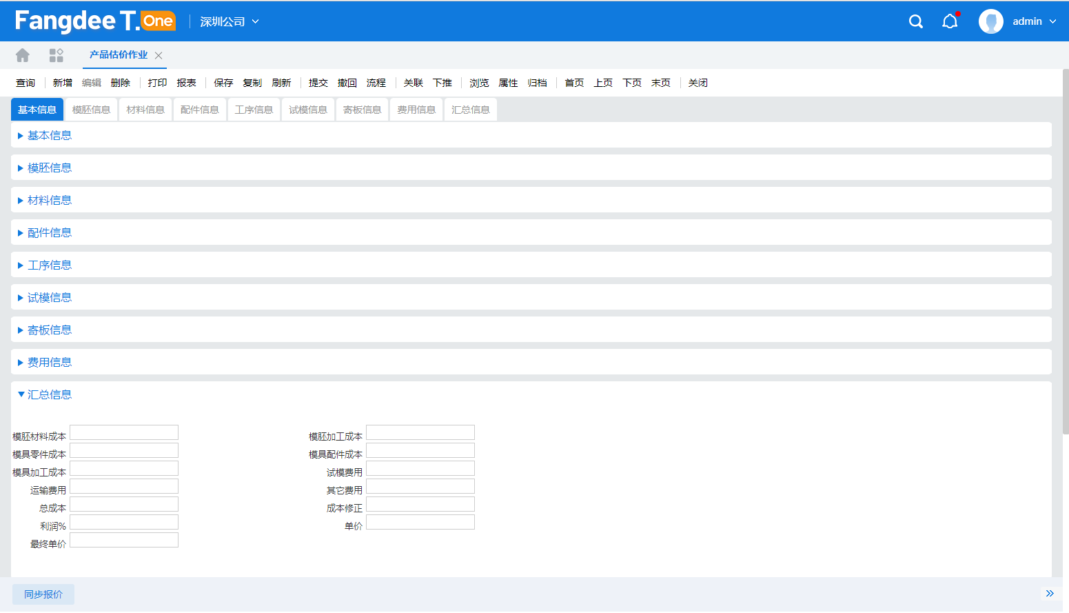 圖3 綜上,借助方天T-ONE系統,可以進行快速精確的模具估價及報價,並且根據客戶需求及實際狀況做出相應調整。然而,最準確的模具成本是業務接單後,製造模具過程中所發生的實際成本,才是最精確的依據。方天T-ONE的報價系統也必須與方天BU阿米巴系統協同使用,才能保障模具報價時所估算的利潤得到真正的實現,讓阿米巴各項利潤指標做為報價的檢查以及經驗的累計,更能擴展收集到模具量產後的保養、維修成本。統計每次修模的原因,建立模俱全生命週期的履歷管理,累積更多的模具開發經驗,有了這些經驗,才能讓我們降本、提質、增效,發展的越來越好。 |